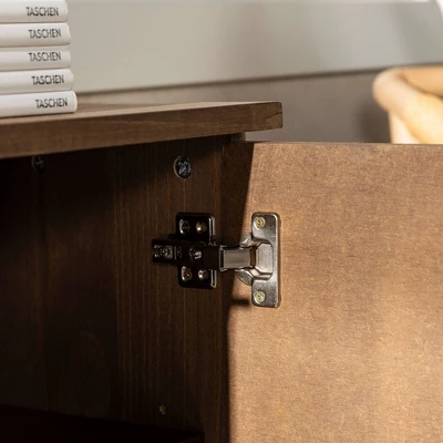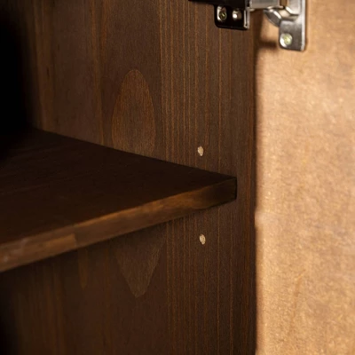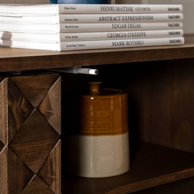 Your furniture should be as extraordinary as you are, and Saracina Home’s Modern Boho Solid Wood 2 Door 2 Drawer Sideboard is far from ordinary. This eclectic closed storage console features two push-close cabinet doors donning a stunning 3D geometric mosaic pattern that will instantly add texture to your space. One adjustable shelf behind the doors is yours to store games, extra place settings, or movies. Two drawers travel on smooth wood runners, and their framed faces beautifully contrast the intricate cabinet doors. Tall, tapered legs offer a hint of mid century modern finesse, while the natural grain of the responsibly-harvested solid pine wood ensures that each piece is unique. Overall Product DimensionsHeight: 30.5”Width: 58.125”Depth: 15.75”Drawer Interior DimensionsHeight: 5.125”Width: 19.125”Depth: 13.5”Cabinet Interior Dimensions (without shelf)Height: 17.625”Width: 33.875”Depth: 13.25”
