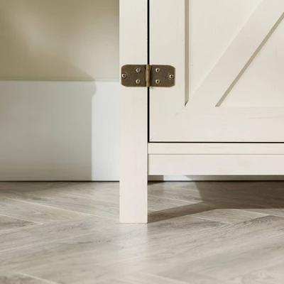Bring a cozy aesthetic into your home with the Clarabelle 44″ Rustic Farmhouse Barn Door TV Stand from Saracina Home. The barn door-inspired cabinet and open shelf offer a convenient blend of open and closed storage where you can proudly display your media components or tuck away clutter. Adjustable shelves mean that you can set up this entertainment unit to your liking. Antique-finish metal accents on the corners and hinges subtly emphasize the rustic theme. Use as a TV stand to support up to a 50-inch TV in your living room or as a mini buffet in the dining room.